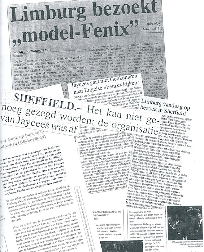 In 1996 koos JCI Genk, met voorzitter Didier Goesaert en programma-directeur Eddy Gieraerts voor een opvallend programma, nl Learning Fenix by doing Sheffield. Om zelf te ervaren wat een project als FENIX betekent eens het realiseert is, trokken de Jaycees van Genk met een delegatie van liefst 170 personen naar Meadowhall in Sheffield. Zowel de politiek, industrie, banken als middenstandsorganisaties waren afgevaardigd tijdens de trip naar Sheffield, en konden daar met eigen ogen een objectief beeld vormen van Meadowhall, maar ook van de gevolgen ervan op het centrum van de stad.